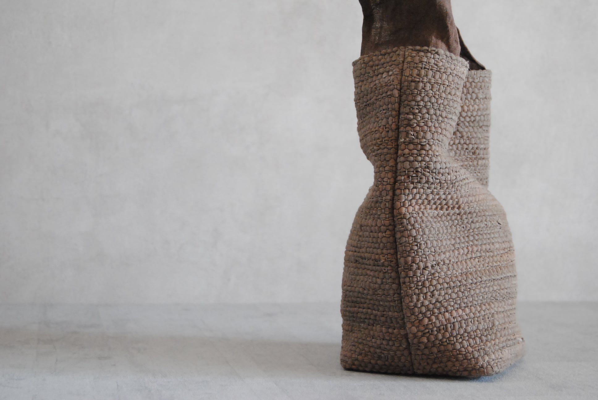 縦長のシルエット、表情のある裂き織り、均一でない柿渋染めの濃淡